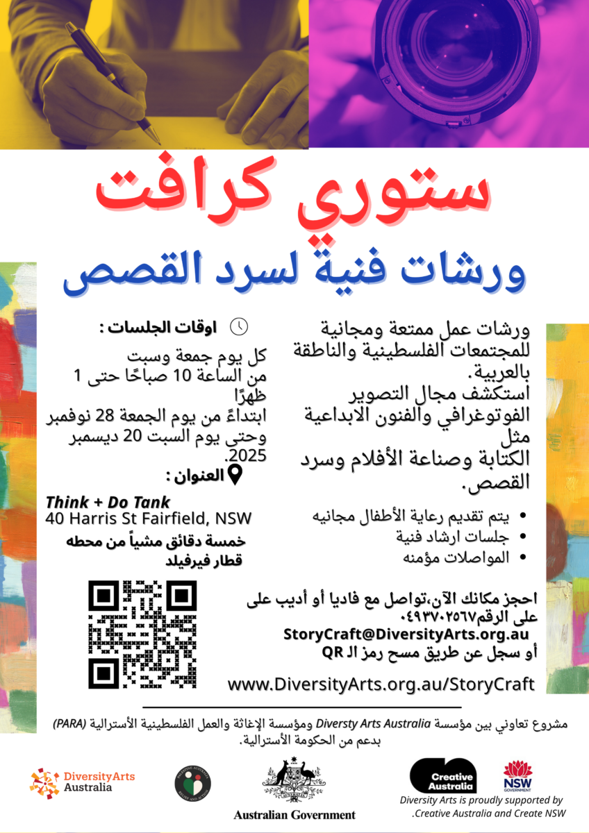 StoryCraft is a free creative program for people from Palestinian and other Arabic-speaking backgrounds who want to share their stories and ideas through the arts.